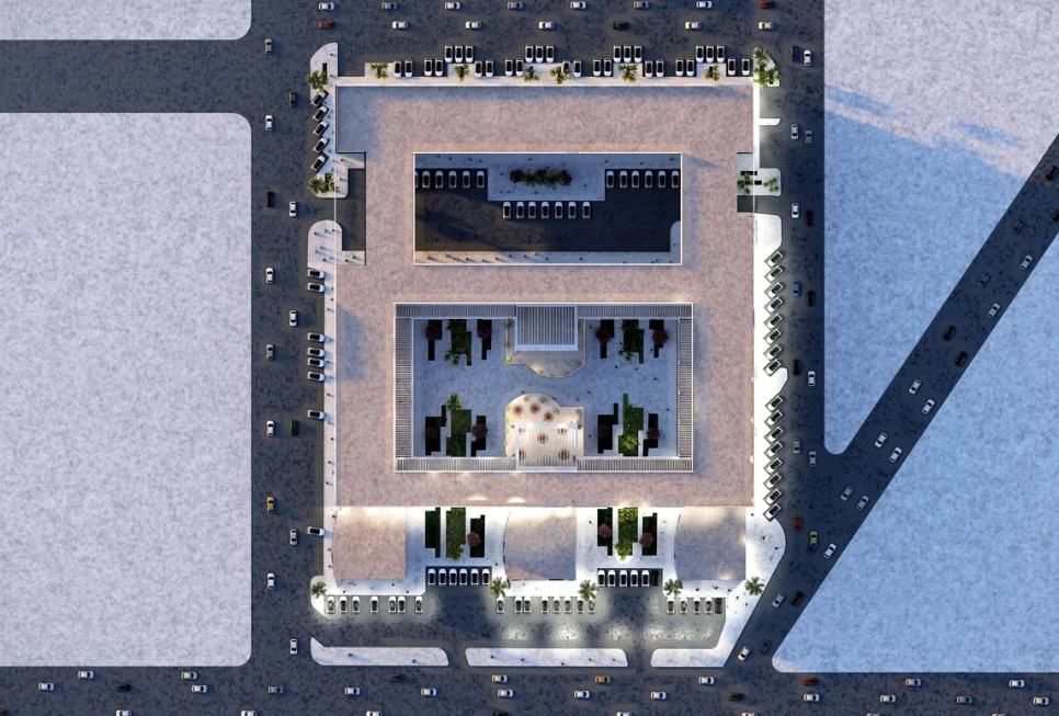 تنطلق هذه الرؤية من الحفاظ على الكتل التجارية السفلية القائمة، مع إعادة صياغتها ضمن إطار معماري متماسك، من خلال إضافة عنصر ربط علوي يوحّد الكتل المختلفة ويعزز الترابط بين الاستخدامات.